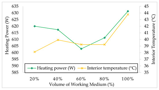 Figure 8 shows the results of heat transfer by means of a loop thermosiphon, the evaporating part of which was loaded with a simulated heat of 750 W from electrical resistance bodies. The analysis of the results showed that the cooling device removed heating power in the range of 615–630 W with an average value of 620 W and average operating temperature inside the electrical enclosure in range of 43–48 °C at all investigated volumes of working medium. In terms of power dissipation to the environment, no dependence of the effect of the amount of working fluid in the evaporator was observed. From the point of view of the temperature in the interiors of the cabinet, it can be stated that at a volume of 100%, the temperature was significantly higher than at a volume of the working substance in the range of 20–80%. The best result was obtained with a working medium amount of 20%, when the cooling system removed a heating power of 620 W from the electrical enclosure and the average operating temperature inside the electrical enclosure reached 38 °C.