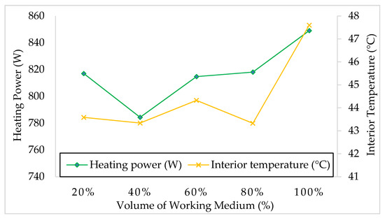 Figure 9 shows the results of heat transfer by means of a loop thermosiphon, the evaporating part of which was loaded with a simulated heat of 1000 W from electrical resistance bodies. The analysis of the results showed that the cooling device removed heating power in the range of 780–850 W with an average value of 817 W and an average operating temperature inside the electrical enclosure in the range of 43–48 °C at all investigated volumes of working medium. In terms of power dissipation to the environment, no dependence of the effect of the amount of working fluid in the evaporator was observed. From the point of view of the temperature in the interiors of the cabinet, it can be stated that at a volume of 100%, the temperature was significantly higher than at a volume of the working substance in the range of 20–80%. The best result was obtained with a working medium amount of 20%, when the cooling system removed a heating power of 818 W from the electrical enclosure and the average operating temperature inside the electrical enclosure reached 43 °C.