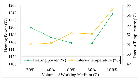 Figure 10 shows the results of heat transfer by means of a loop thermosiphon, the evaporating part of which was loaded with a simulated heat of 1500 W from electrical resistance bodies. The analysis of the results showed that the cooling device removed heating power in the range of 1157–1236 W with an average value of 1185 W and an average operating temperature inside the electrical enclosure in the range of 51–54.6 °C at all investigated volumes of working medium. In terms of power dissipation to the environment, no dependence of the effect of the amount of working fluid in the evaporator was observed. From the point of view of the temperature in the interiors of the cabinet, it can be stated that at a volume of 100%, the temperature was significantly higher than at a volume of the working substance in the range of 20–80%. The best result was obtained with a working medium amount of 20%, when the cooling system removed a heating power of 1200 W from the electrical enclosure and the average operating temperature inside the electrical enclosure reached 51 °C.