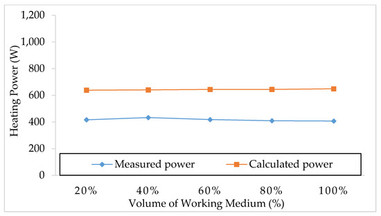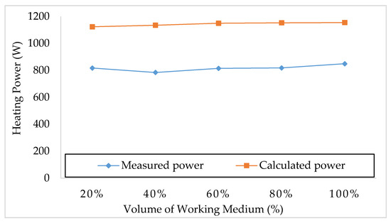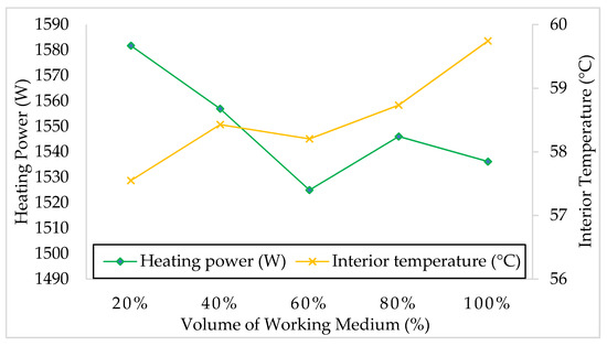 Figure 11 shows the results of heat transfer by means of a loop thermosiphon, the evaporating part of which was loaded with a simulated heat of 2000 W from electrical resistance bodies. The analysis of the results showed that the cooling device operates at all variants of working fluid volume very well when the cooling device was able to remove heating power in the range of 1525–1581 W with an average value of 1549 W and an average operating temperature inside the electrical enclosure in the range of 57.5–59.7 °C. In terms of power dissipation to the environment, the dependence of the effect of the amount of working fluid in the evaporator was observed. In this case, a lower heating power dissipation was observed at the working fluid volumes of 60–100% than at the volumes of 20–40%. From the point of view of the temperature in the interiors of the cabinet, there was a temperature increase that was observed at volumes of 60–100%. The best result was obtained with a working medium amount of 20%, when the cooling system removed 1582 W from the electrical enclosure heating power of and the average operating temperature inside the electrical enclosure reached 57.5 °C.