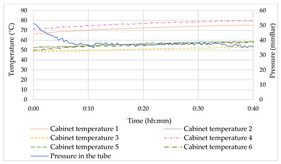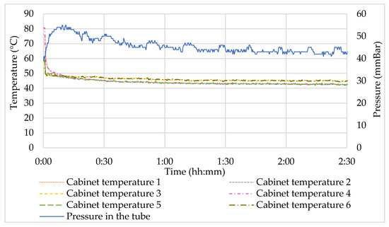 The experimental measurements were performed continuously every day for two weeks under the same conditions. Therefore, the results were not affected. The process of each measurement consisted of creating a vacuum, filling it with a working substance, heating the environment in the cabinet, stabilizing the temperature, and cooling the space and equipment. Figure 12 shows part of one measurement during temperature stabilization.