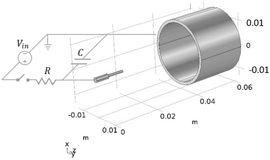 A self-consistent model based on the corona discharge mechanism has been proposed in [24,25,26] to describe the behavior of several key parameters of a specific EHD thruster. Figure 1 shows the geometry of the thruster and the RC coupling circuit, with a needle-type anode and a hollow cylindrical cathode with variable height and internal radius. The applied potential difference between the anode and the cathode varies in the range 0.9–40 kV, the anode grounded and the cathode potential running between those values. The gas pressure and temperature assumed were 10 Torr (1.3 kPa) and 300 K, respectively.