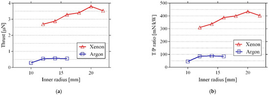 Influence of the cylindrical inner radius in the thruster’s performance at 20 kV: (a) variation of the output thrust T in (μN) for several radius (mm); (b) variation of the thrust-to-power ratio T/P in (mN/kW) for several radius (mm).