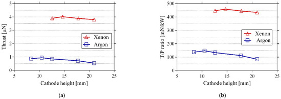 At 20 kV, with xenon as the working gas and starting from the initial cathode height value of 21 mm, we begin by reducing the cathode’s length down to 12.6 mm. These modifications can cause significant changes in the electric potential distribution that could improve our thruster. As we were reducing its length, we observed that values under 12.6 mm would not improve, but instead would unfold instabilities in the plasma. We conclude that at 20 kV, in the case of Ar, the cylinder height should be approximately 10.5 mm, and in the case of Xe, the cylinder height should be around 14.7 mm (see Figure 4a,b) to optimize the output. As we can see, the cathode’s height is not a determinant parameter in the efficiency of the EHD thrusters under study in the range considered.