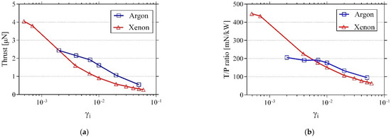 We plotted the thruster parameters such as the thrust versus γi and thrust-to-power ratio vs. γi in, respectively, Figure 5a,b. We observed that by reducing the electrons emitted by the cathode’s surface, the thruster reached an output thrust of 4 μN and efficiencies of nearly 460 mN/kW, whereas, for higher γi values, the thrust would only deliver a thrust of 0.24 μN and an efficiency of 80 mN/kW.