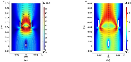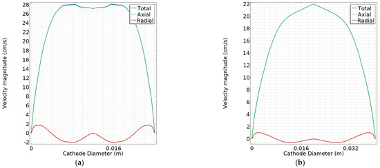 Figure 5a,b present the flow optimal velocity distribution for the two gases utilized in our simulations. Notice that the scales are not the same to enhance images. In both figures, the voltage between the anode and cathode is 20 kV, the ballast resistance is 500 M, and the block capacitor is 1 pF. For the argon thruster, Figure 5a, the cylindrical cathode has a height of 10.5 mm and an inside diameter of 24 mm, while in Figure 5b, for the xenon thruster, the dimensions of the cylindrical cathode are 14.7 mm in height, and the inside diameter is 40 mm.