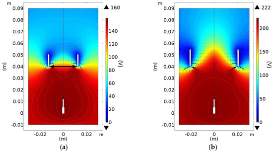 Electric potential distribution (in V units) and electric field (black arrows in V/m units) for the optimal thruster output: (a) thruster with argon as propellant gas; (b) thruster with xenon as propellant gas.