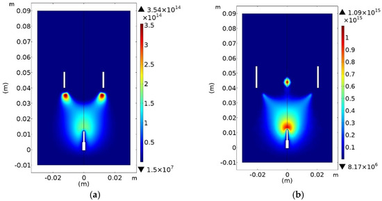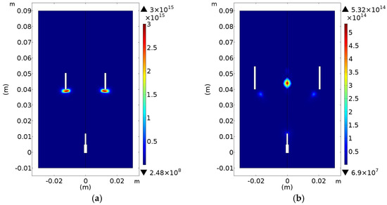 Spatial distributions of electron density (m−3) for the optimal thruster output: (a) thruster with argon as propellant gas; (b) thruster with xenon as propellant gas.