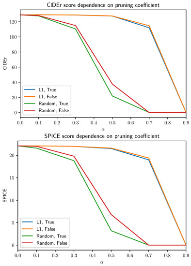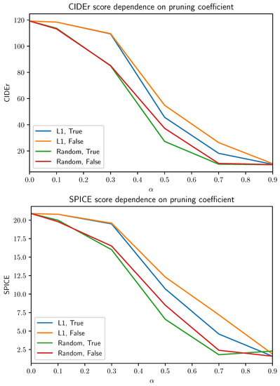 CIDEr and SPICE validation scores dependence on pruning coefficient for different pruning methods applied to the Up-Down model. “L1” indicates that pruning was used, whilist “Random” indicates that random pruning was used. “True” indicates pruning of the embedding layer and “False” indicates no pruning.