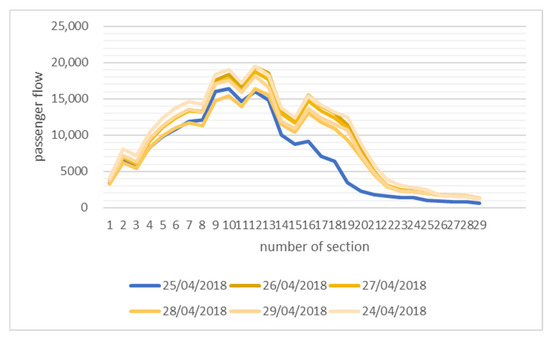 Considering that the focus of this paper is the decline of metro transportation capacity, this paper uses the section passenger flow in each time period of the metro as the analysis data set. The so-called section passenger flow is defined as the number of people who are transported from one station to the adjacent station by the metro every hour. It is assumed that there are stations in a metro line, which is represented as . Then the whole line can be divided into sections, and the passenger flow per unit time of the section can be expressed by , that is .