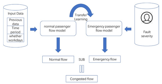 The purpose of this model is to realize passenger flow prediction under normal and emergency conditions. Therefore, this paper is divided into two parts. The first part is to complete the normal passenger flow forecast of metro transportation, and the second part is to forecast the emergency passenger flow based on the normal passenger flow forecast, as shown in Figure 2.