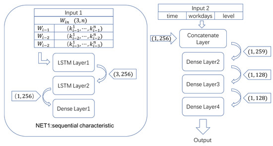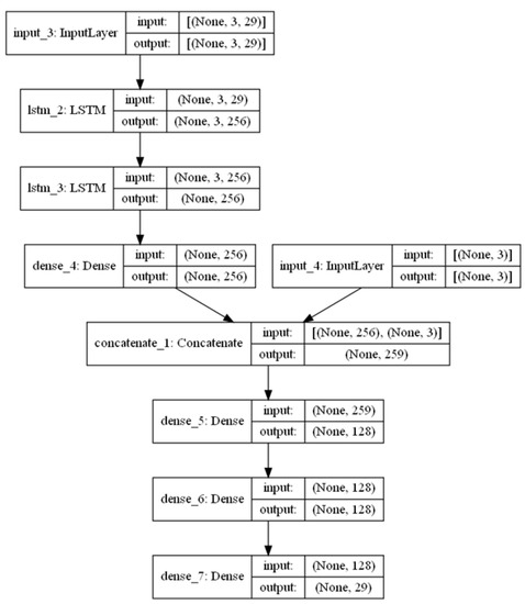 The input and output of the traditional machine learning model based on time series are usually time-series data. However, in this paper, the time period, working day and fault severity data are the properties of the passenger flow, and they are not time series. Therefore, they cannot be used as the input of the LSTM network, and need to add a dense layer. A multi-input and single output neural network is constructed, in which the LSTM part is responsible for extracting the time-series features of section passenger flow, and the dense layer part is responsible for mixed judgment of time period, working day and fault severity. The whole network is shown in Figure 4.