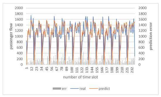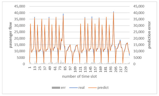 Section 1 shown in Figure 6 is from Nanjing East Road station to people’s Square Station, which is a representative large passenger flow interval of line 2. A total of 14 days are randomly selected, and the prediction results are shown in the figure below. It can be seen that when the passenger flow is large, the prediction of normal passenger flow has high accuracy.