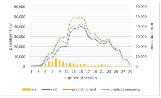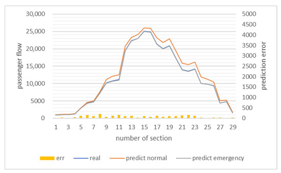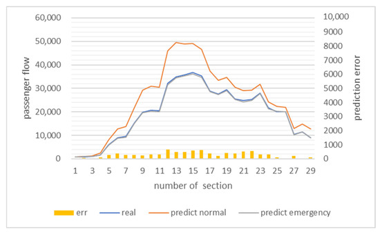 However, for the prediction of emergency passenger flow, the network accuracy is greatly reduced without transfer learning, with an average error of 12.6%, but the average error is only 9.74% compared with the predicted normal passenger flow, which means that the predicted value of emergency passenger flow is actually closer to the predicted normal passenger flow and cannot correctly predict the emergency passenger flow we need. The following Figure 11 is a representative example.