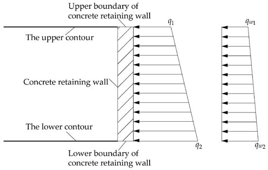 where γ is the bulk density of a homogeneous single stratum, γ’ is the effective unit weight of the stratum, Ka = tan2(45° − φ/2) is the Rankine active earth pressure coefficient, h1 is the thickness of the strata above groundwater level, h2 is the thickness from below the groundwater level to the boundary of the concrete retaining wall, h3 is the net height of the concrete retaining wall, and q1 and q2 are the earth pressure at different positions of the concrete retaining wall.