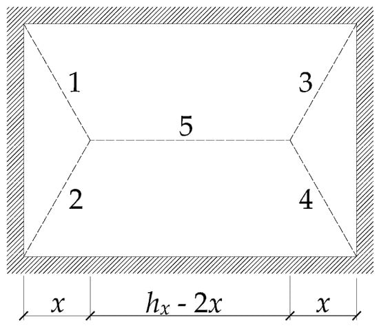 The length of the rectangular concrete retaining wall bearing the uniformly distributed load is hx, and the width is h3. Assuming the limit state, the plastic hinge method is shown in Figure 5. Here, x is temporarily regarded as an unknown number. The deflection of line segment 5 is one.