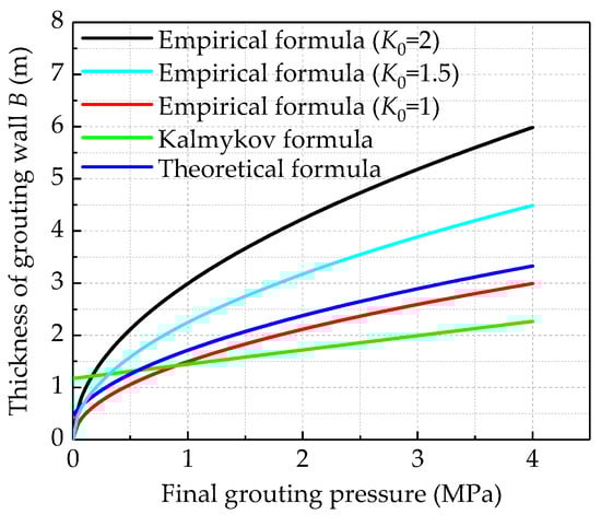 - In the Kalmykov formula, there is a linear relationship between the final grouting pressure and the thickness of the concrete retaining wall. When the final grouting pressure is low, the thickness of the concrete retaining wall obtained by the Kalmykov formula is greater than that obtained by other formulas. With an increase of the final grouting pressure, the increase of the thickness of the concrete retaining wall is slight. The applicability of the Kalmykov formula is poor when the final grouting pressure is either small or large.