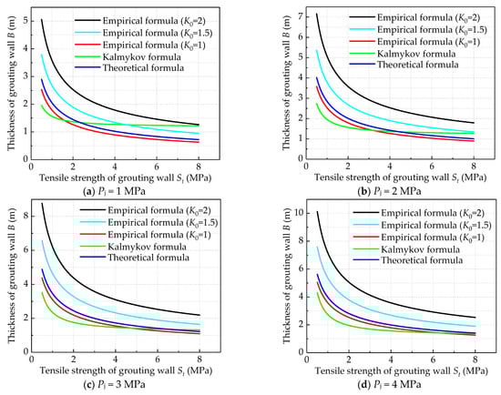 Therefore, we propose combining the calculation examples and taking four working conditions (final grouting pressure Pj = 1, 2, 3, and 4 MPa) to analyze the curve relationships between the concrete tensile strength and the thickness of the concrete retaining wall, as shown in Figure 7.