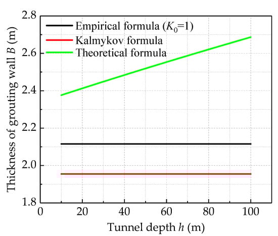 - Under the same final grouting pressure, the tunnel depth obtained by the theoretical formula is approximately positively correlated with the thickness of the concrete retaining wall. In the traditional empirical formula and Kalmykov formula, the influences of ground stress and groundwater pressure on the thickness of the concrete retaining wall are ignored, so the effect of the tunnel depth on the concrete retaining wall is not considered.