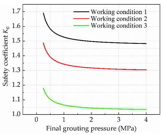 According to the basic parameters of the above calculation example, we proposed adopting the following three working conditions (size of concrete retaining wall: 6 m × 4 m; 6 m × 6 m; 6 m × 8 m). The relationship between the safety coefficient K0 and the final grouting pressure P was analyzed, as shown in Figure 9.