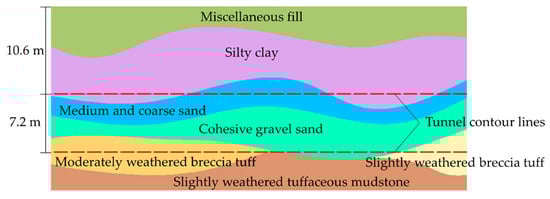 The Linghuang interval tunnel of Qingdao Metro Line R3 in Huangdao District mainly passes through a medium and coarse sand layer, silty clay layer, and moderately weathered breccia tuff layer, and the risk assessment is level II. In the interval section, YSK14+187-YSK14+342 on the right line; half of the tunnel face is made up of sand, silty clay, and other unfavorable geology, and the lower half comprises moderately weathered breccia tuff. The construction of the left line has reached ZSK14+267.5, and the surrounding rock conditions of the tunnel face have significantly changed. The tunnel face of the upper step is made up of sand, silt, silty clay, and other unfavorable geology, which is similar to the stratum exposed on the right line. The single hole of the tunnel has a width of 6 m and a clear height of 7.2 m. Part of the geological profile is shown in Figure 10.