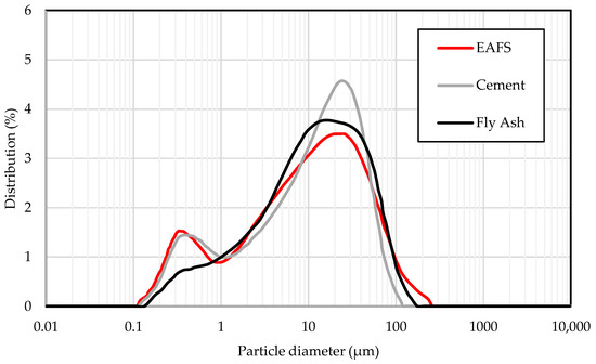 Figure 1 presents the results of the particle size distribution of the EAFS after the milling process. Ordinary Portland and fly ash (FA) from a coal power plant were tested as reference materials. EAFS showed a bimodal particle distribution curve similar to FA and cement. The highest peak of both the EAFS and cement curves indicated a similar particle diameter of 25 μm. However, the peak corresponding to cement’s curve was sharper than the one of EAFS, showing a higher distribution percentage. EAFS and cement showed another peak at 0.35 μm, indicating the presence of very fine particles. In contrast, FA showed a wider peak at 20 μm and a lower distribution percentage at 0.35 μm compared to EAFS and cement.