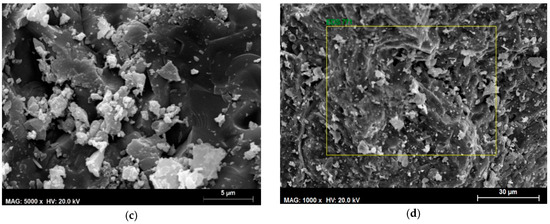 SEM micrographs of EAFS sample (magnification of (a) 100×; (b) 500×; (c) 5000×; (d) 1000×).
