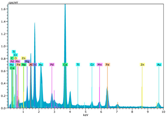 In Figure 2a, the EAFS particles are irregular in shape, dispersed, and have angular morphology. In addition, finer particles were observed on the surface of the larger ones (Figure 2b). On a larger scale view, vitrified surfaces are seen resembling those of materials exposed to elevated temperatures (i.e., greater than 1600 °C) suggesting the possibility of pozzolanicity and reactivity to alkali activation (Figure 2c). Moreover, the EDS test was carried out on the area presented in Figure 2d and the results were graphically represented in Figure 3. The corresponding EAFS particle is composed of around 50.6% oxygen, 18.0% calcium, 7.1% silicon, 6.2% of iron, and other components. This primary composition matches the mineralogical composition of the EAFS XRD results (Section 3.1) showing high calcium content seen as white particles (Figure 2d), as well as silicon oxide and iron oxide.