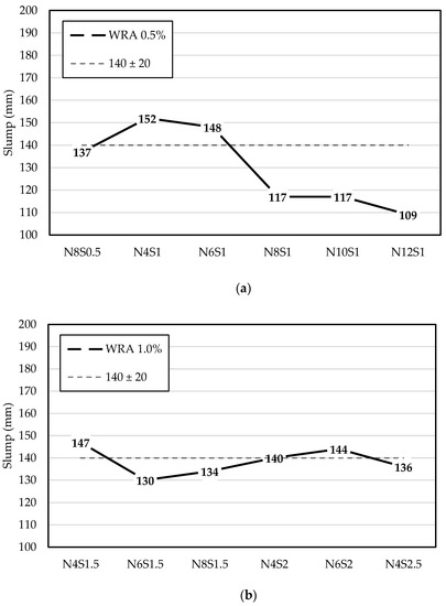 The mortar’s workability was evaluated by their slump according to the EN 1015-3 standard [45]. The target slump had been initially set at 140 ± 20 mm. The superplasticizer was used and adjusted accordingly between 0% and 1.0% depending on the Na2O/binder and SiO2/Na2O ratios to achieve constant workability. Increasing the Na2O/binder ratio led to a reduction in workability. This was due to the higher viscosity of the alkaline solution after the addition of a solid solute. It was also expected that the mixes would lose workability after a short time for higher SiO2/Na2O ratios due to flash setting; Ca2+ ions from the EAFS quickly react with the silicate ions from the solution, leading to the precipitation of an initial C-S-H, which is responsible for the setting [34]. Therefore, it can be stated that there is a linear correlation between the Na2O/binder and SiO2/Na2O ratios and the workability. However, mixes N8S1, N10S1 and N12S1 presented a slightly lower slump between 109 and 117 mm (Figure 5a) due to the increase in viscosity of the alkaline activator. Therefore, the superplasticizer content was increased to 1.0% for mixes with silicate modulus ratios of 1.5 and higher, to adjust the workability and the slump which ranged between 130 and 147 mm (Figure 5b).