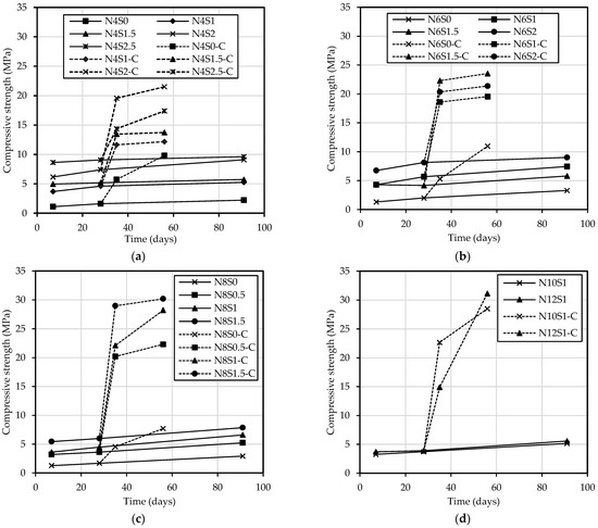 Average compressive strength: (a) 4% sodium concentration; (b) 6% sodium concentration; (c) 8% sodium concentration; (d) 10% and 12% sodium concentration (Mix code-C represents carbonated specimens).