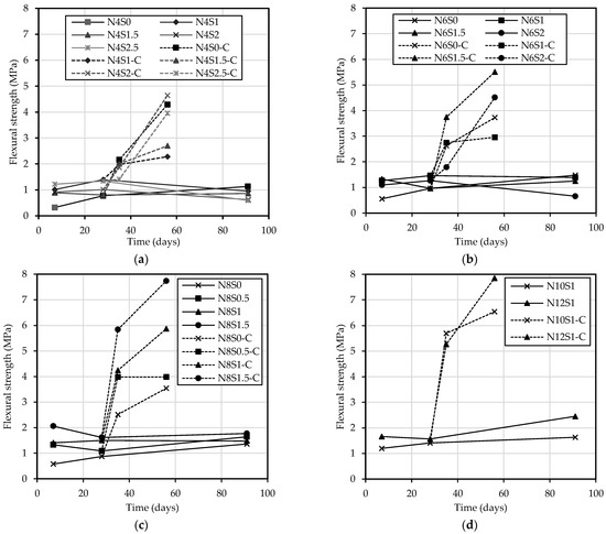 Average flexural strength: (a) 4% sodium concentration; (b) 6% sodium concentration; (c) 8% sodium concentration; (d) 10% and 12% sodium concentration (Mix code-C represents carbonated specimens).