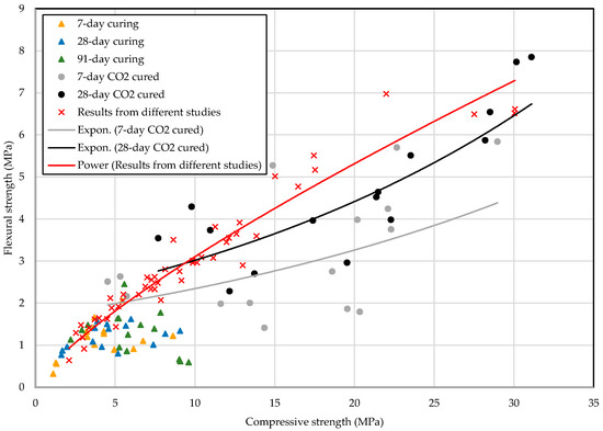 Carbonated specimens with enhanced performance, in which exponential relationships were observed between the flexural and compressive strength, suggested otherwise. The 28-day relationship of carbonated specimens was close to that obtained by standard 40 × 40 × 160 mm cement mortar prims from other studies [59,60,61,62,63,64,65,66]. The improvement in flexural strength between 7 days and 28 days is likely due to the greater polymerization of SiO2 gels from the greater amount of decalcified calcium silicate phases (e.g., C-S-H). The isotropic growth of these phases, but especially of those growing perpendicularly to the loading vector, led to improved flexural strength.
