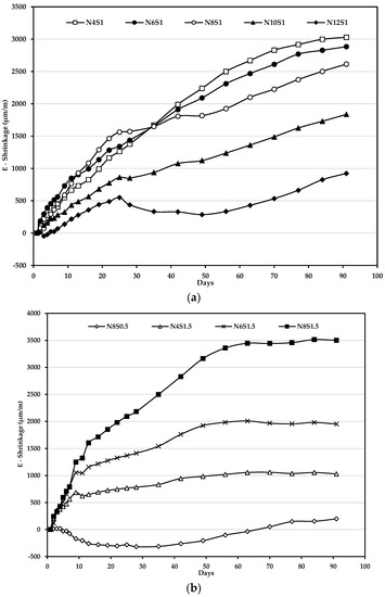 Shrinkage for AAEAFS mortars: (a) values for mixes with silicate modulus of 1.0; (b) values for mixes with silicate modulus of 0.5 and 1.5.