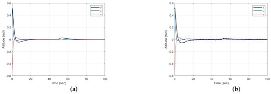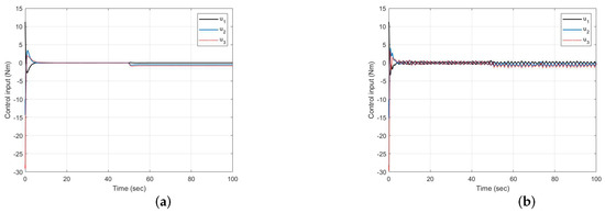 According to the above derivation process, we could find that all signals of closed-loop system are bounded. Based on the Lyapunov theorem and Lemma 2, the sliding mode exists and the states of the whole system are uniformly ultimately bounded. From the above derivation, it can be seen that the reaching time of the SMC can be estimated by , where is the reaching time, is the initial value of the Lyapunov function candidate, and is a positive design parameter. Therefore, the corresponding time can be reduced by adjusting the parameter . The proof ends here. □