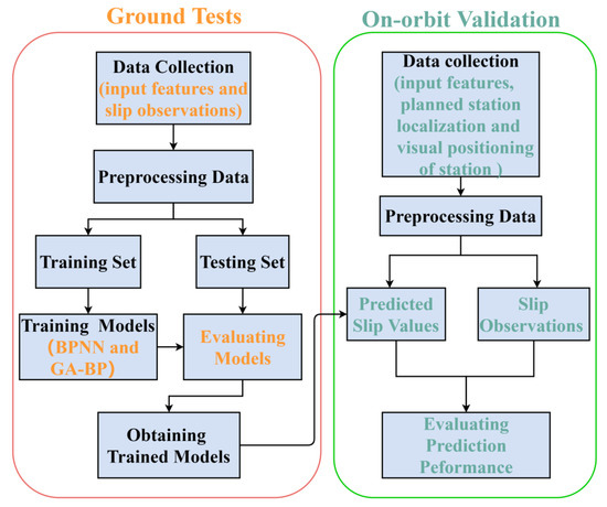 The BP models and GA-BP models which learned from the ground tests data were validated using Zhurong’s on-orbit data. The real-time actual coordinates during Zhurong’s walking process could not be obtained, so it was impossible to directly verify the accuracy of the predicted slip values during the walking process. We could convert the predicted slip_x and slip_y into a longitudinal offset ∆x and lateral offset ∆y, respectively. Therefore, we could obtain the slip prediction corrected path points. When we compared the end point of the predicted path with the actual points, the predictive effect of the models could be seen. The specific implementation steps were as follows: