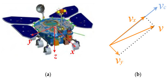(a) The body frame of Zhurong rover; (b) velocity decomposition.