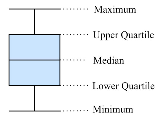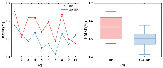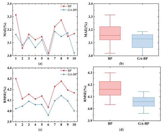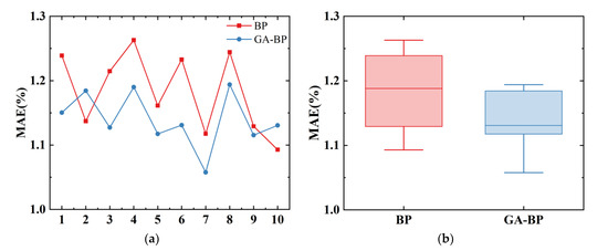 We repeated the hold-out validation on the models of each type ten times to ensure a better stability and reliability of results. Twenty models were obtained in total with BP and GA-BP; the prediction results are summarized in detail in Table 3. A boxplot was used to show the distribution of evaluation results for each model in the following, as shown in Figure 8: the maximum value, upper quartile, median, lower quartile, and minimum value are represented from top to bottom.