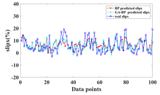 Figure 11 and Figure 12 show part of the prediction results of slip_x and slip_y in group (1), respectively. Since the testing set data were randomly selected, the testing data points were not continuous, and so it was not suitable to show all testing data since they were too dense and no trend could be seen. In order to show the prediction results more clearly, Figure 11 and Figure 12 only show the prediction of 100 data points. The predicted results were consistent with the trends of actual values, but the actual slip_x and slip_y had a larger variation range, while the prediction data of BP and GA-BP were relatively concentrated. According to statistics, out of 1911 test points in group (1), there were 987 slip_x points predicted by GA-BP, which was closer to the actual slip_x than the points predicted by BP, and the amount of 1078 slip_y GA-BP prediction points was closer to the actual slip_y than the BP prediction points. It can be seen from the above analysis that GA-BP had a higher prediction accuracy than BP.
