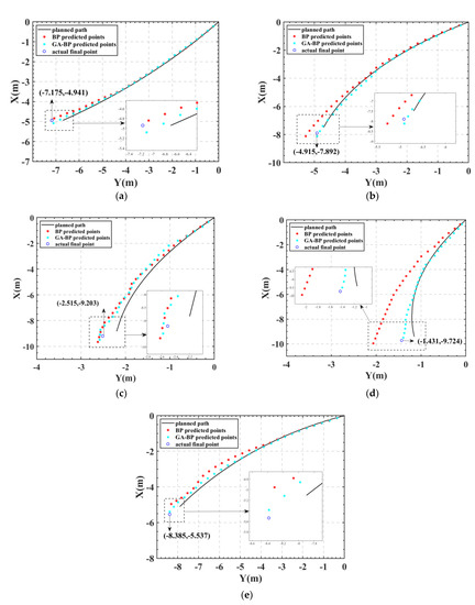 In this paper, an on-orbit validation was conducted based on data obtained from mid-June 2021 (sol.27–sol.36) with five movements. Table 4 shows the planning path information and actual end points of arrival. We could see that there was always a deviation ∆L between the actual path end point and the planning point, The maximum ∆L could be obtained as 0.6784 m. Table 5 displays the information of the BP and GA-BP predicted end points of the path. In each set of data, the ∆L_BP and ∆L_GABP were always smaller than ∆L; combined with the predicted path and planning path shown in Figure 14, we could see that the predicted end points were closer to the actual points. From the relative positional relationship between the actual end point and the planned path, it could be seen that the rover deviated to the right during the driving process. Both BP and GA-BP predicted paths simulated this movement trend, but the BP model predicted the path to a greater degree of deviation compared to the GA-BP model, which led to the BP predicting end points relatively far from the actual end point, especially in Figure 14d. The GA-BP model had a more stable prediction performance, and the GA-BP predicted paths were reasonably acceptable for showing the slip behavior of the rover during motion.