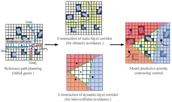 The model predictive priority contouring control with double-layer corridors is proposed in this section. The whole framework is shown in Figure 3. First of all, reference path planning is performed using the ICBS planner. The reference paths are adopted as an initial guess of model predictive priority contouring control. Then, the construction process of double-layer corridors is described in detail. The double-layer corridors are applied as safety constraints of model predictive priority contouring control. At last, a prioritization mechanism is devised to improve the computational efficiency of model predictive contouring control. The improved algorithm is defined as model predictive priority contouring control.