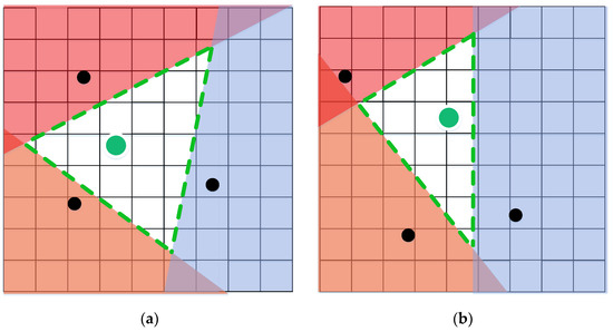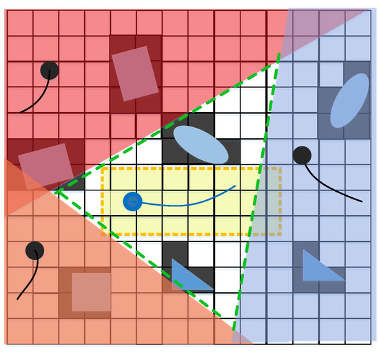 In Figure 5, the green circle represents robot m and the convex area marked with green dotted lines is the dynamic-layer corridor of robot m. For robot m, it treats other robots as obstacles with velocity. Other robots are indicated by black circles in Figure 5. For robot m, it cannot collide with robots that are too far away. To reduce the consumption of computing resources, reciprocal avoidance distance L is introduced. For any two robots m and n, if their relative distance , then ignores the dynamic-layer corridor construction between them. The steps to construct dynamic-layer corridors are as follows.
