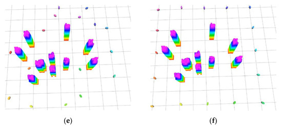 Disturbances include position disturbances and angular disturbances. In this paper, the covariance matrix is used to represent the disturbances. The covariance matrix is set to . The last one represents the angular disturbance and the other two terms are the position disturbances. The starts and goals of the robot are shown in Table 1. The operation of the multi-robot system is shown in Figure 8.