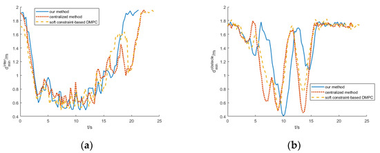 In terms of safety, the successful results of all methods are compared. Figure 10a presents the minimum distance between robots. In addition, Figure 8b illustrates the minimum distance between robot and obstacle. The minimum distance between robot and obstacle for our method, the centralized method, and the soft constraint-based DMPC are 0.40 m, 0.38 m, and 0.40 m, respectively. Moreover, the minimum distances between the robots for our method, the centralized method, and the soft constraint-based DMPC are 0.50 m, 0.51 m, and 0.44 m, respectively.