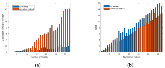 In this section, the computational performance and the quality of the results of our method are further compared with other methods. Simulations are performed under different numbers of robots. The cost is utilized to evaluate the quality of the results and calculation time per horizon is utilized to evaluate the computational efficiency. Since the soft constraint-based DMPC does not guarantee a 100% success rate, our method is compared with the centralized method. The robot operating environment and parameter settings are the same as in Section 5.1. The covariance matrix is set to . The results are shown in Figure 11.