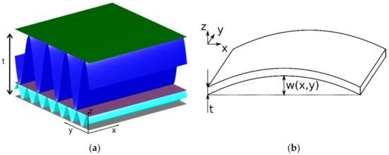 Equation (4) is usually used to describe the moments and, in combination with (3), the stresses in a plate deformed by external forces. The linearity of Kirchhoff theory allows use of the (negative) internal stresses of the flat plate instead: the deformation by external forces that would cause exactly the negative stress values in a plate without internal stress leads to a compensation and therefore a relaxed state in a plate with internal stresses. The proposed model approximates the corrugated board as a homogenous orthotropic plate; however, internal stress must ultimately be introduced by the paper sheets, which are of negligible thickness compared to the board. Therefore, the relationship between the corrugated board and the idealized plate model needs to be analyzed.