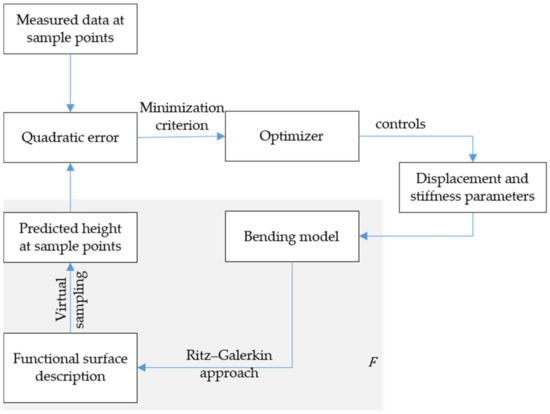 To achieve this, the model (16), denoted as “Bending model” in Figure 4, is used to predict the deformed surface using a mesh-free Ritz–Galerkin approach (the implementation used here follows largely the simple textbook approach as explained, for example, in [23] and would most likely provide room for improvements). It should be noted that, although this step is only shown as an arrow in Figure 4, it requires an iterative algorithm to calculate the parameters defining the surface (“Functional surface description” in Figure 4). This prediction step is seen as a function mapping the parameters mentioned previously to a vector of the expected surface heights at given sampling points. The final step of this mapping (“Virtual sampling” to generate “Predicted heights at sample points” in Figure 4) is a simple evaluation of the functional surface representation defined by the parameters at the known sampling points.