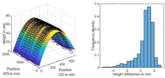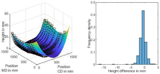 Two examples (size of the boards 1884 × 770 mm and 1430 × 1040 mm, respectively) from ongoing research are presented in Figure 5. While boards were obtained from a commercial production plant, they would have been considered waste due to the amount of warp present. The surface defined by the model (displayed as continuous, colored surface in the plots) shows the same shape as the measured data points (black circles in the plots) on a larger scale, while smoothing local variations. The interpolation capability of the model is shown by the fact that only a 6 × 6 grid of measured data points (highlighted as red crosses in Figure 5) was used as input to the fitting algorithm, while the other data points were reserved to verify the results. Some slight systematic deviation from the data can be seen near the edges of the board, which are most likely caused by the numerical solver for the differential Equation (16). The histograms in Figure 5 show the deviation between the measured points and the surface defined by the proposed model, with most of the data points only deviating by a few millimeters (95% of the measured data points are within 2.6 mm and 2.9 mm, respectively, of the reconstructed surfaces in the examples) from the model surface. Since, as seen in the 3D plots, the model surface reproduces the large-scale deformation of the corrugated board—in other words, the warp—the remaining deviations can be seen as being part of the noise when analyzing or controlling warp.