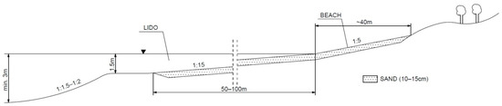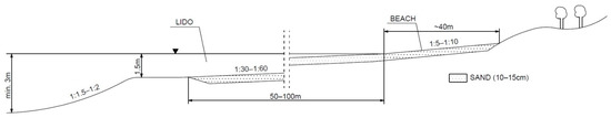 Typical recreational reservoirs have a defined beach area, while the remaining part of the reservoir may be used for fishing or water sports, e.g., sailing or diving. Such objects have different requirements which mostly depend on the technical and geological conditions. The inclination of the above-water slopes which are not beaches should be 1:2 or 1:3 for clastic rocks and 1:1.5 or 1:2 for clays, while in the case of underwater slopes, it should be 1:5 [5,7,8]. Figure 2 is a schematic view of a bathing area (a lido) located in an old excavation of rock raw materials.