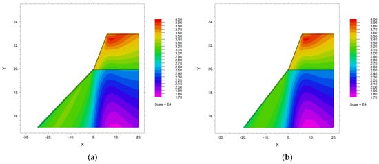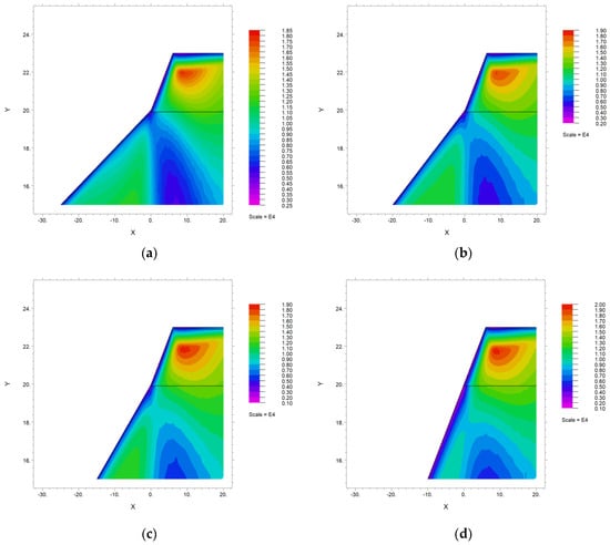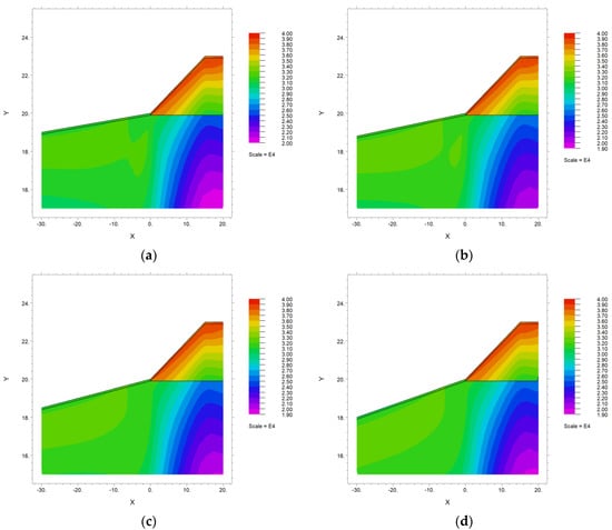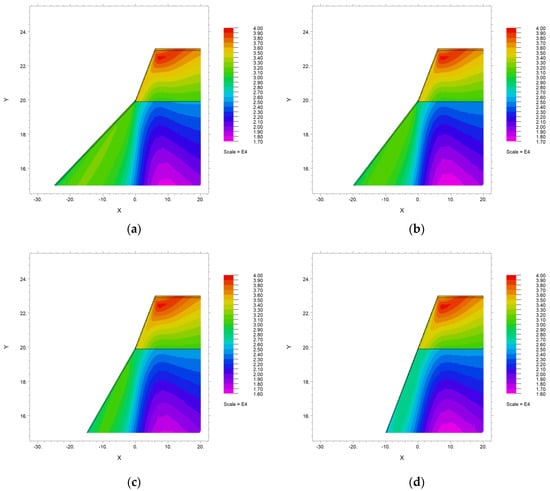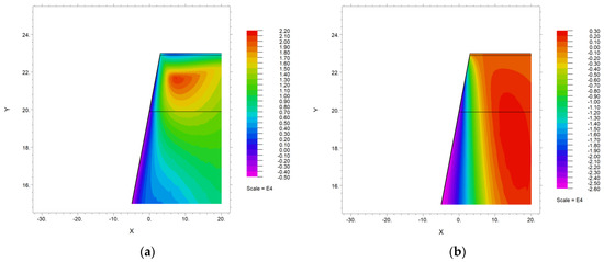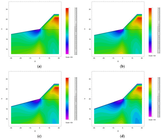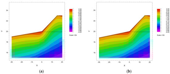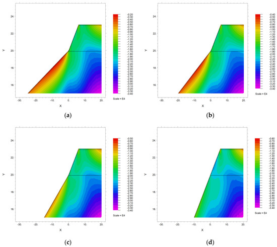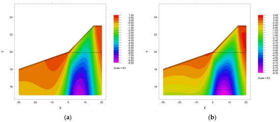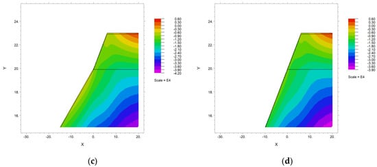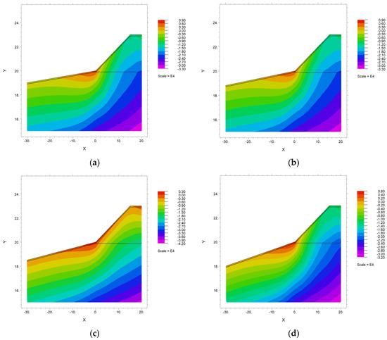 Figure 9 and Figure 10 show horizontal stresses for clay and for coarse sand, respectively. The increasing of the inclinations within the assumed range did not influence the simulation results, with higher stresses observed for clay. From the perspective of slope stability, calculations of the Coulomb–Mohr potential are more important. They are shown for both types of soil in Figure 11 and Figure 12. The potential sign was not observed to reverse in any area, which suggests good stability conditions for both underwater and above-water slopes, for both media.