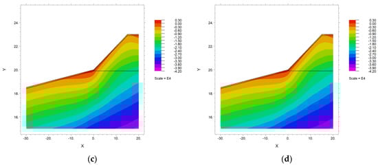 Coulomb–Mohr potential for the clay-type subsoil, for underwater slope inclinations of (a) 1:30, (b) 1:25, (c) 1:20, (d) 1:15 (negative values indicate compressive stresses in Pa, and positive values—tensile stresses in Pa).